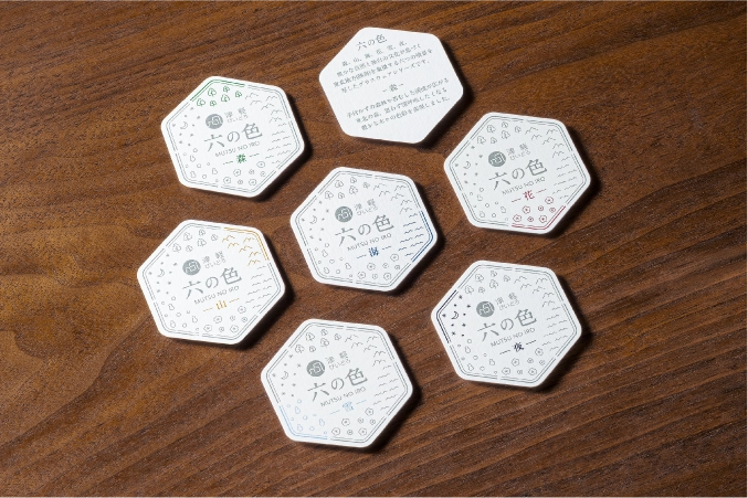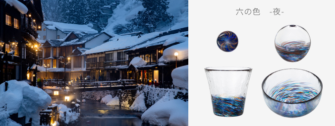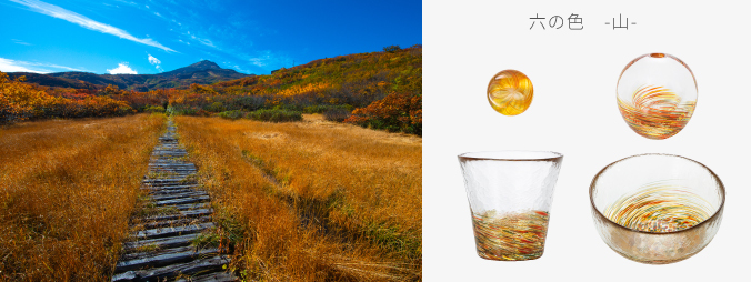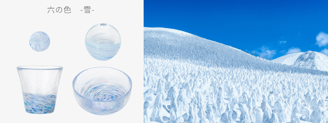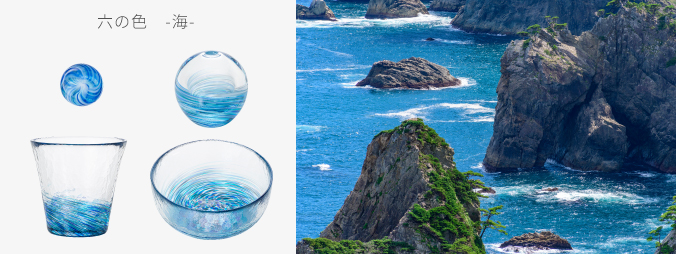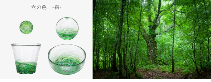 「六の色(むつのいろ)」は、かつて陸奥(むつ・みちのく)と呼ばれた東北地方の情景から着想を得たシリーズです。森・山・海・花・雪・夜、東北を象徴する六つの情景をガラスに写しとりました。「六の色」の特長は、“深みと陰影のある色彩”です。森の深い緑、海の底を思わせる群青、夜の静けさをたたえた闇色など、落ち着いた色合いが空間に上品な趣をもたらします。